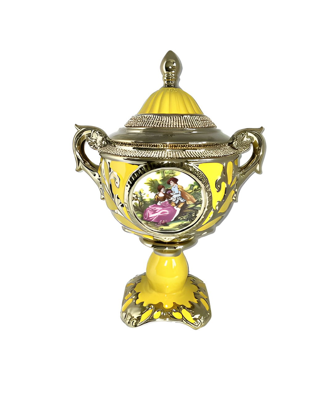 - Yellow with golden accents porcalain trophy shape Vase for Ochun.. Measures: 16 inches Height, 8.5 inches wide and 7 inches depth.